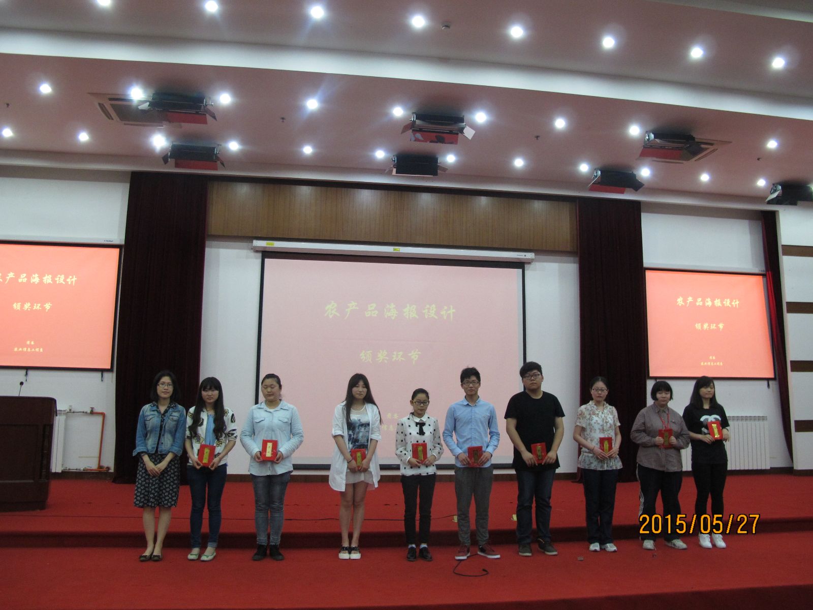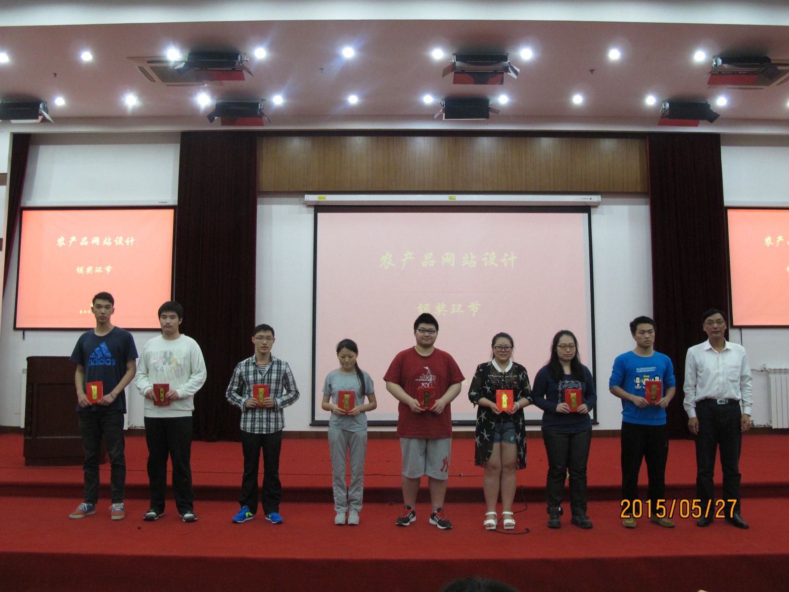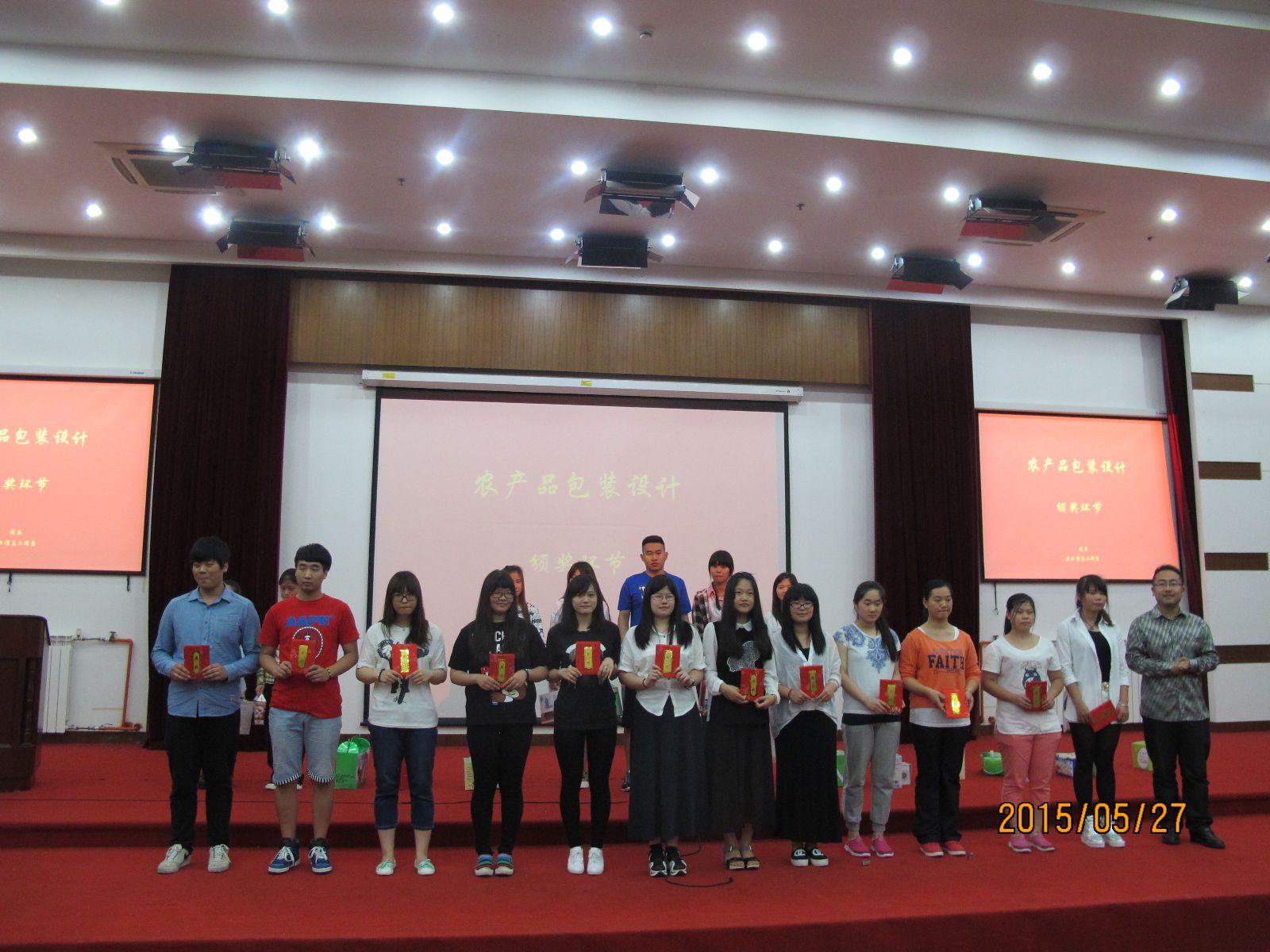 活动现场对农产品包装大赛、农产品安全海报大赛、农产品网站设计大赛进行颁奖,每项大赛评选出人气大奖一等奖2名、二等奖4名、三等奖6名。获奖学生代表陈宸和程昊星2位同学对作品的设计理念进行了分享。