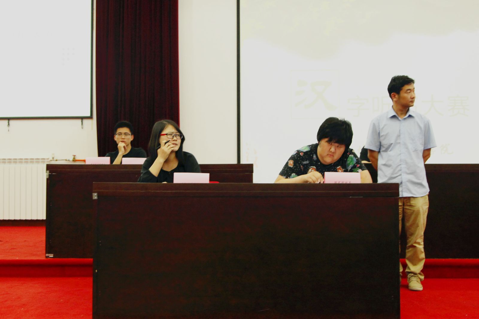 经过前期初赛,五系各有一支队伍进入团体决赛,并选拔了10名学生进入个人决赛。同学们在团体赛上进行紧张商量和书写,再次重温对母语汉字的感觉。现场求助更调动了在场师生书写汉字的热情,有的拿起手机查阅,有的则用笔在纸上书写。个人赛考验了同学文字功底和实力,比赛一度胶着,同学们分数都很接近,最终才分出胜负和名次。