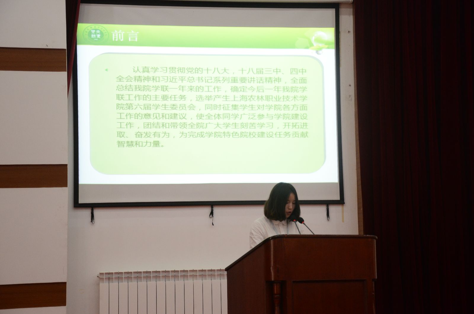 第五届学联主席顾家鑫同学向大会作了题为《坚持思想引领,竭诚服务青年,把握机遇,脚踏实地,以改革创新精神推动学联工作新发展》的工作报告,院实践部部长金思宇同学向大会作了《上海农林职业技术学院第六次学生代表大会提案工作报告》,农业信息工程系学联主席周嘉同学宣读了《大会倡议书(草案)》