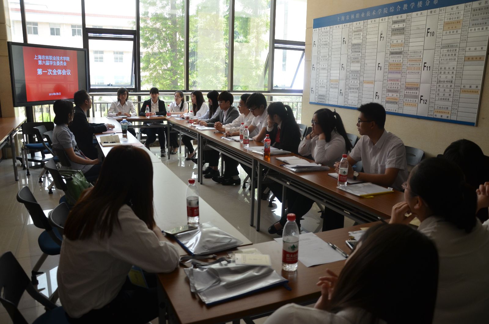 上海农林职业技术学院第六次学生代表大会胜利闭幕后,院学联第六届委员会第一次会议在综合教学楼2楼会议室举行,团委书记许昊、副书记胡慧春和院学联第六届委员会11名委员参加会议。