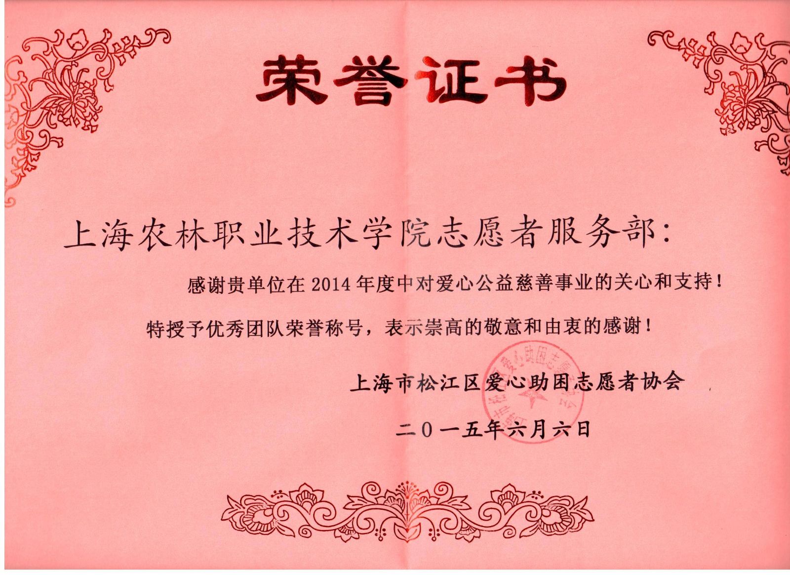 6月6日下午,松江区爱心助困志愿者协会开展2014年度“优秀志愿者”表彰活动,我院农生系“爱心衣救”志愿者服务队获“优秀团队”荣誉称号。此次优秀团队评比以社会义工队、各高校服务队在2014年全年的综合表现为参考。