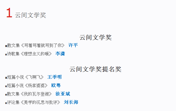 据悉,2015年松江区“云间文学艺术奖”评选工作自2014年底启动以来,共收到申报作品158件,经专家评审委员会认真评选,共评选出“云间文学奖”作品2件,“云间文学奖提名奖”作品4件。