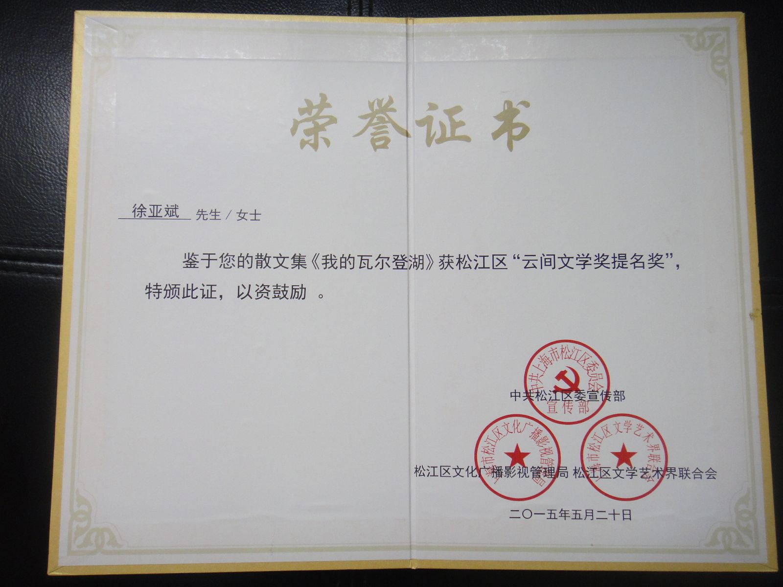 近日传来喜讯,由松江区委宣传部、松江区文化广播影视管理局、松江区文学艺术界联合会共同举办的2015年松江区“云间文学艺术奖”评选中,基础部资深教师徐亚斌的散文集《我的瓦尔登湖》喜获松江区“云间文学奖提名奖”,这是徐亚斌老师继去年的散文集《父亲与烟的记忆》获奖之后,又一次获得此项荣誉。