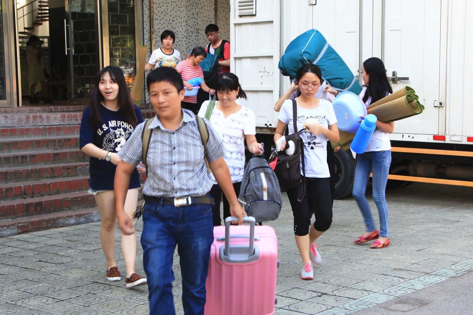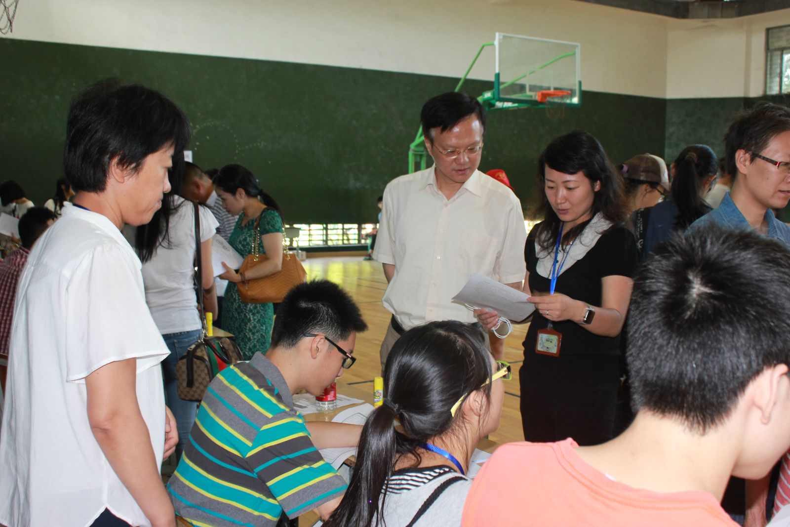 一大早,7点不到,头戴小红帽的志愿者们已经在校门口排好队伍。体育馆里各班主任老师及工作人员一切准备就绪。新生和家长们陆续步入校园。志愿者们主动上前帮助提行李、引导路线,直到办好手续,将新生和家长送到宿舍寝室内,然后又匆匆赶回校门口迎接下一位新生。一位志愿者说:“我们当年也是学哥学姐迎进来的,现在我们也要迎接学弟学妹们,把我们团结友爱、互帮互助的精神传下去。”各班主任指导新生登记各项信息,详细解说这几天的迎新活动安排,耐心回答家长提问,忙得顾不上喝水。老师们说:“又是一批新生进校了,要在开始就让他们感受到学校的温暖。”