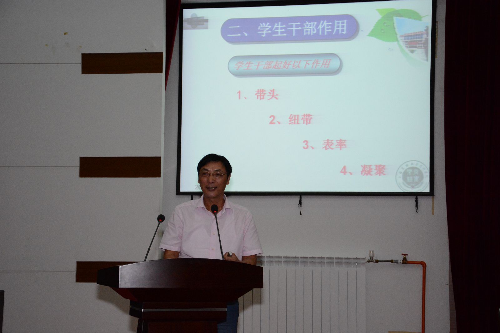 党委副书记、副院长俞锦禄就《怎样当好一名学生干部》作专题培训,从何为学生干部、学生干部作用、学生干部素质要求、学生干部必备能力和学生干部应处理好的几个关系等方面进行了具体阐述,同时引用原北京大学校长王恩哥的十句话勉励同学们要勇于担当责任感,树立为同学们服务的意识,加强和改进自身建设,为全院青年作出榜样和示范。