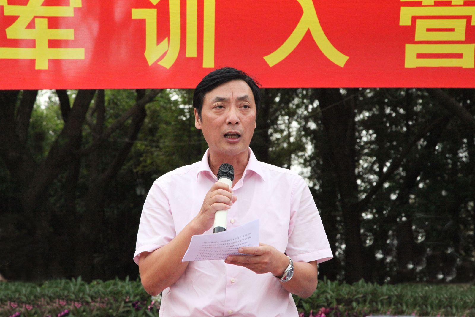 开幕式上,锦绣园学生素质教育培训中心主任杨伟良首先发表致辞。他详细阐述了军训的意义,并对新生如何保质保量地完成军训任务提出了具体要求。接着,园林152班喻航同学代表全体军训学员承诺,将严格遵守纪律,认真学习军事技能,虚心向教官学习军队的好传统好作风,管理好自己的内务,以优异的军训成绩向学校汇报。随后,军训团团长倪南飞教官对新生做军训要求,并介绍了军训团连队编制。