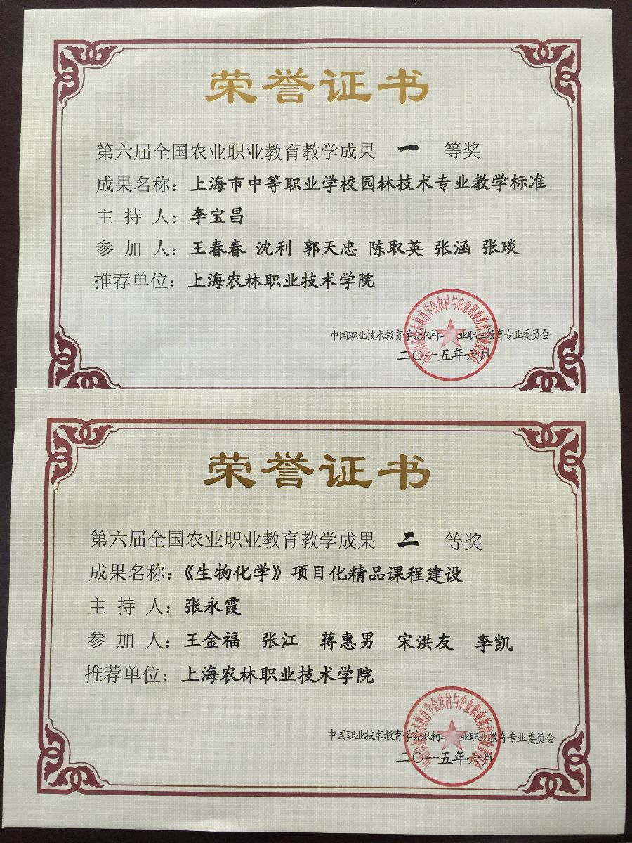 近日,第六届全国农业职业教育教学成果评审结果发布,我院李宝昌老师主持的《上海市中等职业学校园林技术专业教学标准》获一等奖,张永霞老师主持的《<生物化学>项目化精品课程建设》获二等奖。
