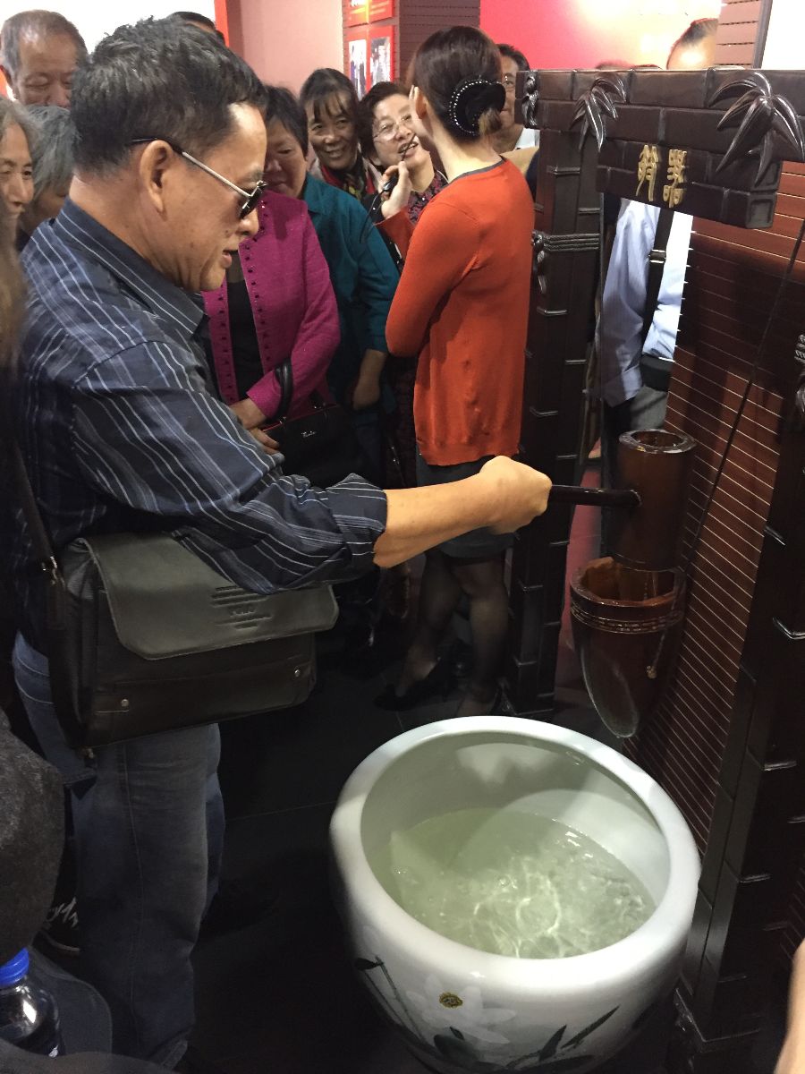江桥镇太平村的工作人员带领退休教职工参观了村史馆。部分老师饶有兴致地体验村史馆中的欹器,欹器只能注入三勺水,告诫人们满招损,谦受益,地位越高态度要越谦和,官位越高更要关注民生。