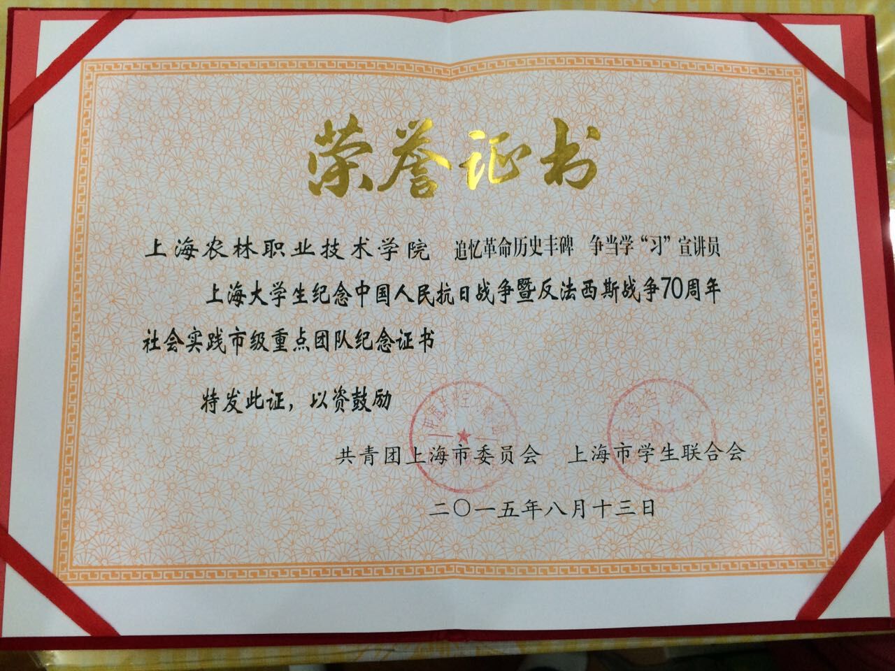 近日,从上海市“青春拥抱和平”纪念中国人民抗日战争暨世界反法西斯战争胜利70周年思想分享会上得知,农业经济管理系“追忆革命历史丰碑 争当学‘习’宣讲员”项目荣获上海大学生纪念中国人民抗日战争暨反法西斯战争胜利70周年社会实践市级重点团队纪念证书,是唯一一个获得此项荣誉的高职院校团队项目。