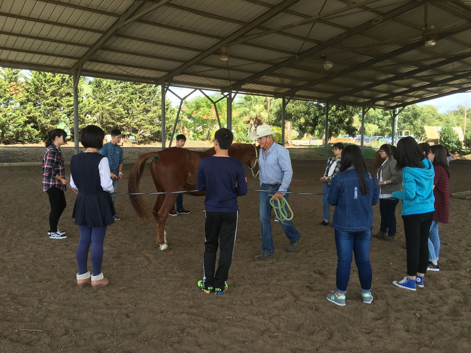 为让同学们尽快适应在以色列的学习生活,以方教师Mike为同学们上了一堂有趣的驯马课,让我方学生很快就融入以色列课堂,提问答疑,积极互动。在教学实践环节,我方学生参观以色列的大型牛场、学校牛场和家庭牛场,在学习牛病防治,牛类繁殖与管理,牛奶品质管理后,和以方学生一起投入到牛场一线工作中。虽然语言上我方学生与对方学生的交流沟通有些障碍,但是同学耐下心来,努力学习,踏实肯干,打扫牛棚,挤奶,喂食小牛,很快就可以熟练操作,受到了对方教师的好评。