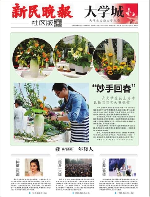 11月4日,新民晚报大学版头版头条,报道了我院园艺园林系园艺134班邱莎莎同学获上海市民插花花艺大赛银奖,再次展现了我院大学生的风采。新闻报道由我院车逸兰、王一鸣同学撰写。
