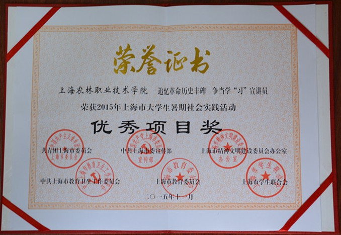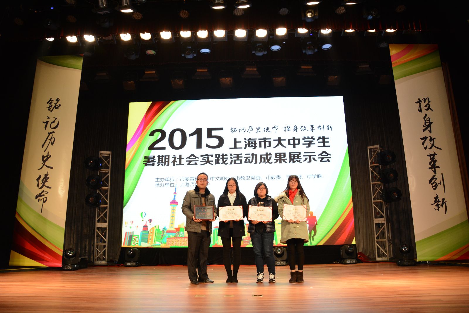 11月28日,2015年上海市大中学生暑期社会实践活动成果展示会举行,会上表彰了一批在活动中表现突出的项目、个人和集体。我院“追忆革命历史丰碑,争当学‘习’宣讲员”项目荣获2015年上海市大学生暑期社会实践活动优秀项目奖,冯靖老师荣获优秀指导教师,陶怡雯、杜益鸣同学荣获先进个人,学院荣获优秀组织奖。