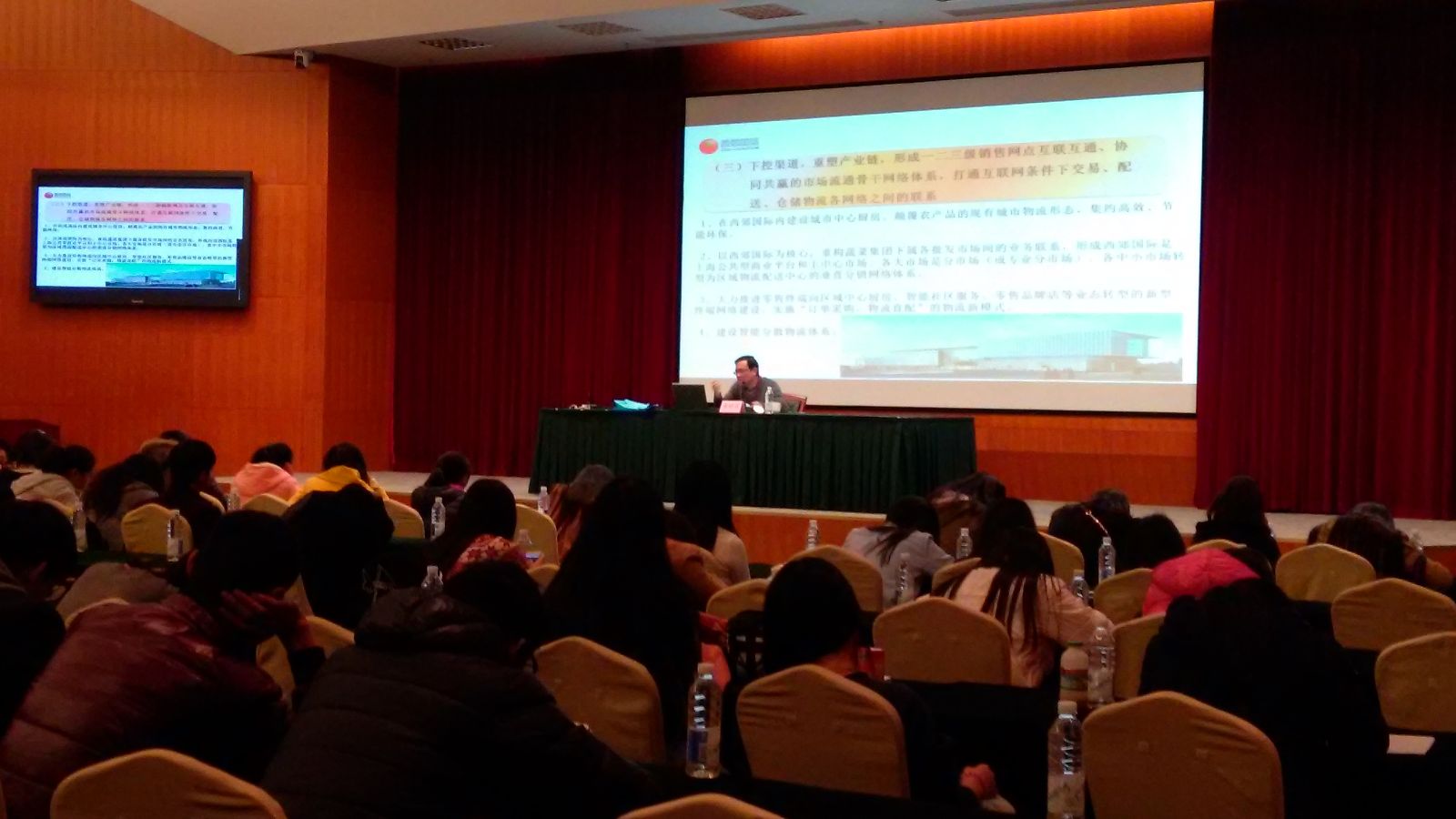 实地参观后,农产品交易中心副总裁张晓灵为同学们讲授了西郊国际的建设、现状及愿景规划。他结合交易中心的建设目标、方法、商业运营模式、盈利模式展开了说明。“上控资源、中控平台、下控渠道”与同学们课堂上学习的产业链形成共鸣;“主中心、一级批、全覆盖”与同学们学习的“农超对接”形成震荡;“实体市场与虚拟市场双轮驱动”与同学们学习的传统价值链、虚拟价值链形成共鸣。同学们认真记着笔记并在互动环节争相提出各种问题。其中许清同学提问:课堂上学到的国家大力提倡“农超对接”对批发市场有什么影响?得到张老师的好评并予以详尽解答。