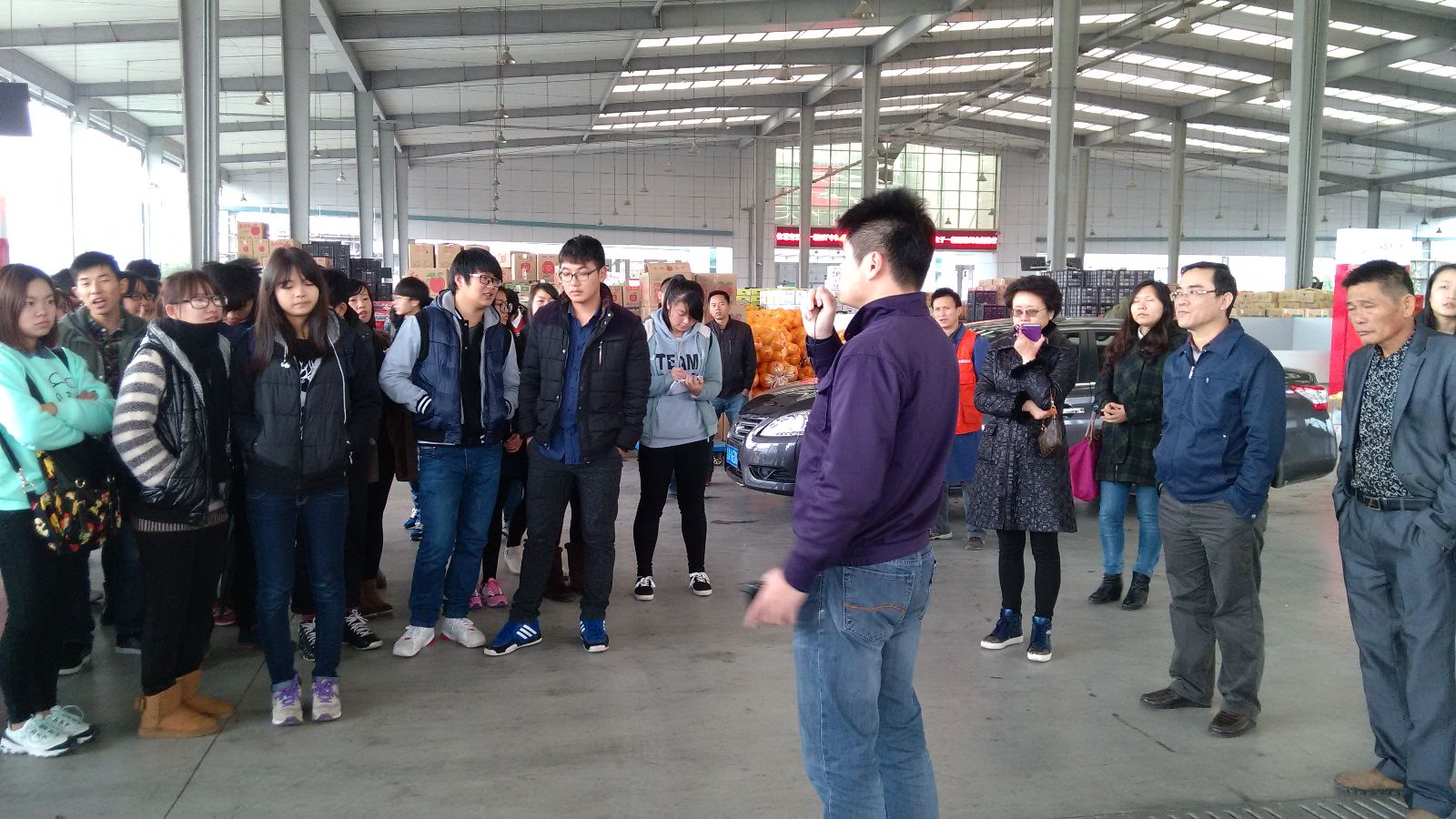 12月2日下午,农经系2015级的93位学生在系主任高萍、任课教师金旭霞和辅导员张婧敏带领下,来到西郊农产品交易中心,进行《农业经济学》课程“农产品市场与价格”项目实训。农产品直销中心朱皓董事长、邱艳庭总经理,农产品交易市场副总裁张晓灵热情接待了师生。