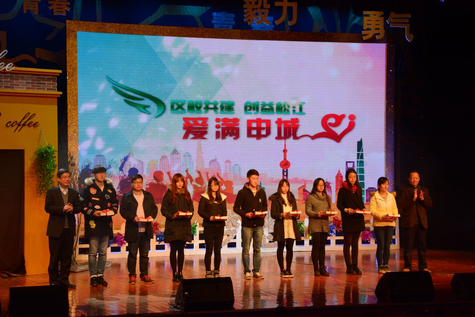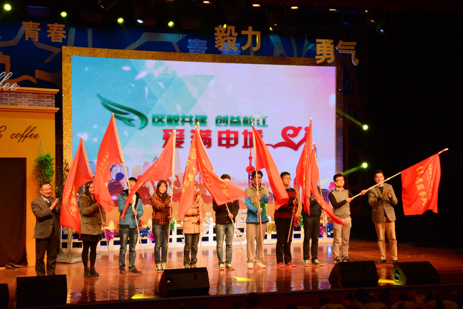 活动现场,师生们观看了音乐剧《青春之歌》,体验了松江大学城志愿者参与志愿服务事业的感人点滴,我院志愿者代表上台接受领导授旗和赠送志愿服务纪念册,青协负责同学向与会嘉宾与青年志愿者代表、市民代表介绍了我院志愿者在松江参与各类志愿服务概况。