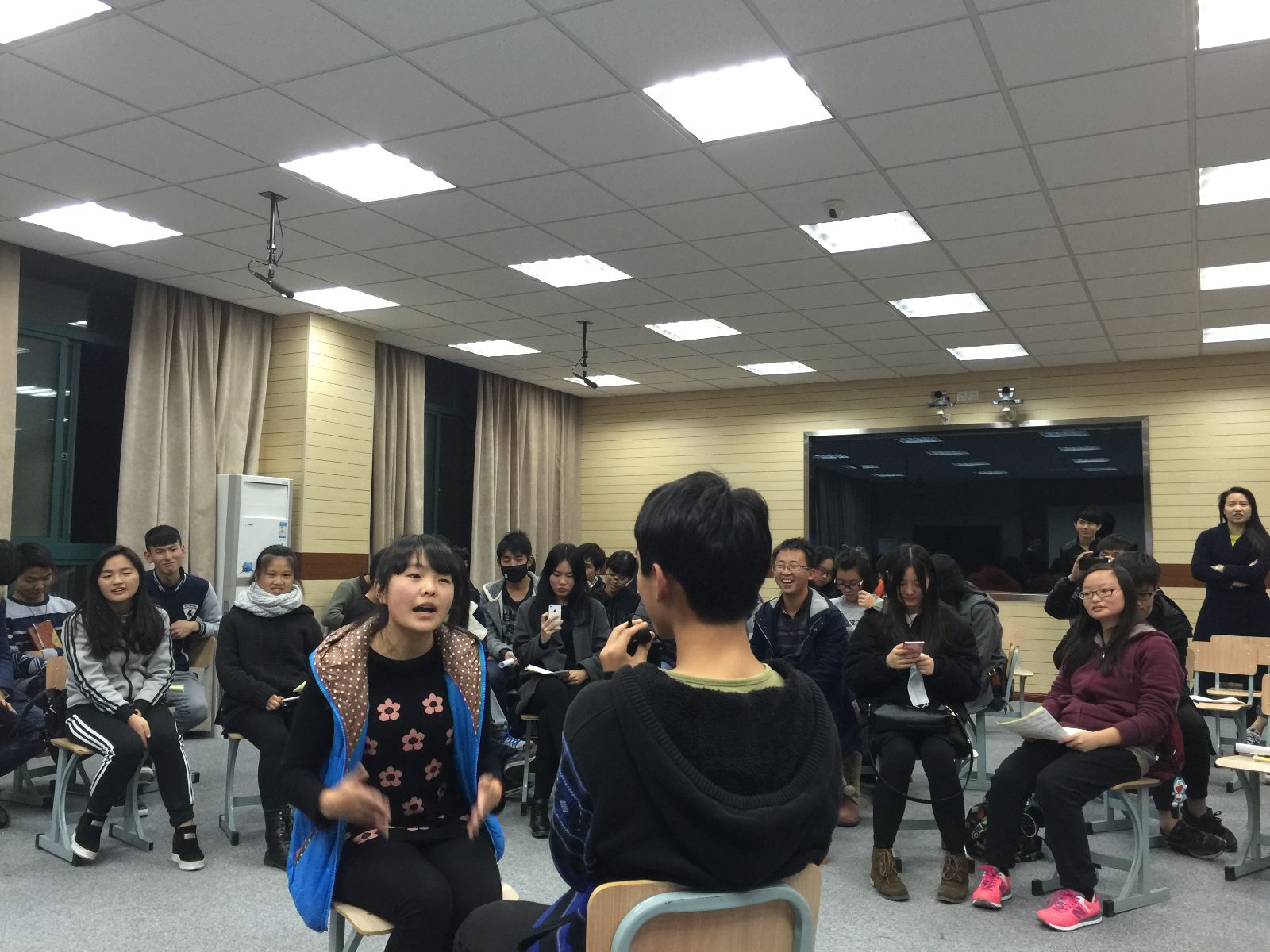 培训中,各班心理委员在明确角色功能后,通过一系列互动体验,知晓了“同感-探索-评论-建议”的沟通模式,并以心理情景剧的方式对不同案例加以模拟和分析,在角色扮演中体会如何倾听他人、如何设身处地理解他人、如何进行有效沟通。