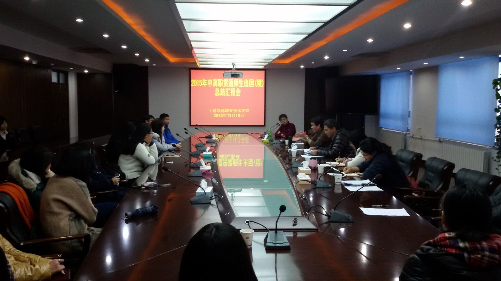 12月10日,在1101会议室,学院组织召开2015年中高职贯通师生出国(境)学习总结交流会。分管领导王彤光出席,国际合作交流处处长辛琳、随团出国(境)师生和相关工作人员共40人参加会议。