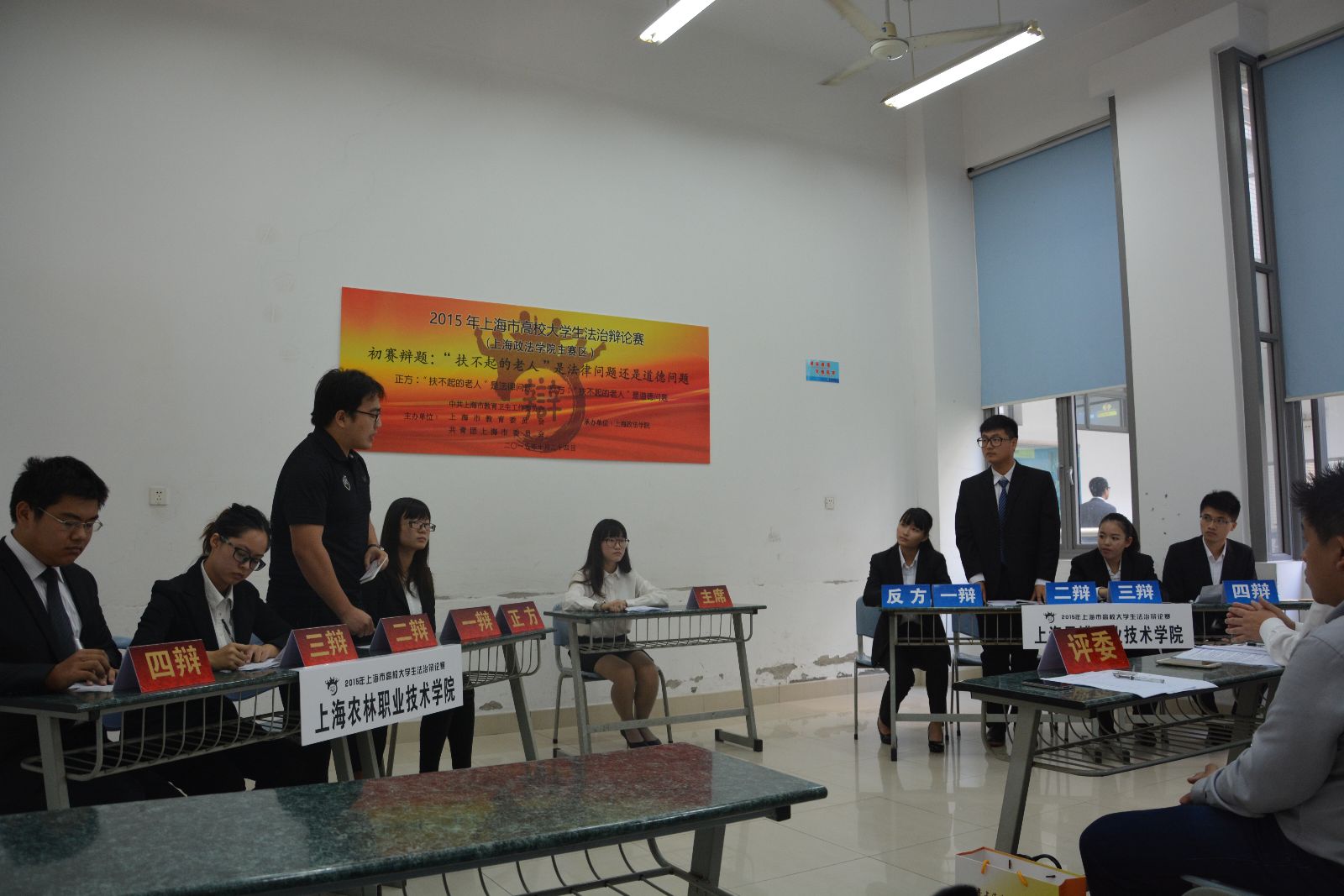 初赛环节,我院分别与上海思博职业技术学院、上海健康医学院、上海海事职业技术学院以及上海工艺美术职业学院就辩题“扶不起的老人,是法律问题还是道德问题”展开激烈角逐,双方唇枪舌剑、你来我往,同学们在辩论场上以雄辩的口才、敏捷的思维、有力的论证,最终获得两胜两负的成绩。