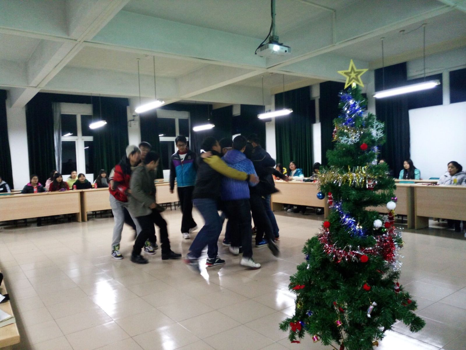 晚会内容丰富,有舞蹈《感恩的心》,古典吉他弹唱《无与伦比的美丽》,小品《练习反义词》,互动游戏“发纸条”“抢凳子”“桃花朵朵开”“传话”等一系列小游戏节目。每个节目都经过精心准备,现场发挥出色,赢得了同学们阵阵喝彩声。尤其是互动游戏环节,将活动气氛推向高潮,让同学们完全融入到团队之中。大家集体拍照,定格美好一幕。
