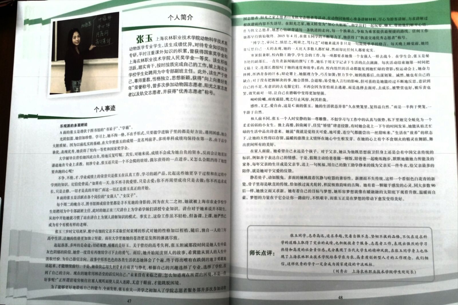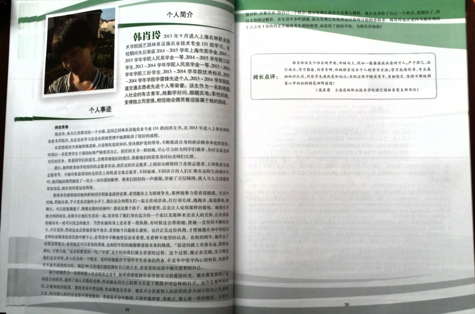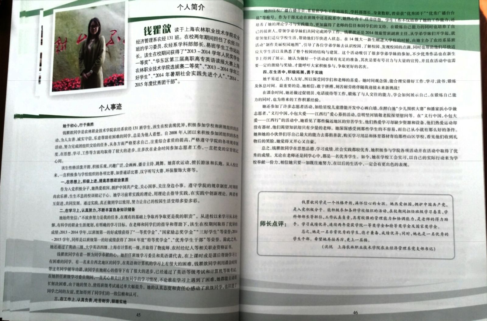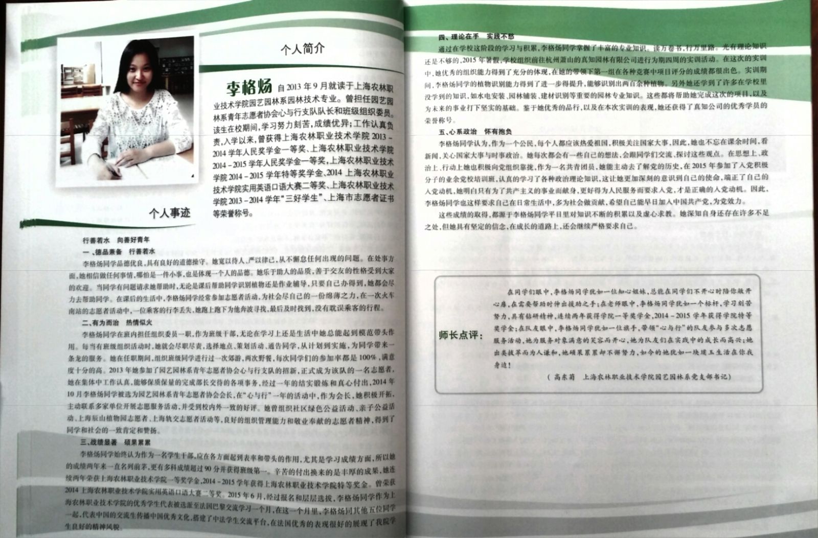 日前,上海市学生事务中心主编的《2014-2015学年上海高校国家奖学金、上海市奖学金获奖学生风采录》近期发行。学院四名优秀学子的先进事迹:园艺园林系李格炀的《行善若水 向善好青年》, 韩肖玲的《拥抱青春》,农经系钱瞿歆的《始于初心 行于焕然》以及动科系张玉的《乐观派的多面娇娃》入选其中。