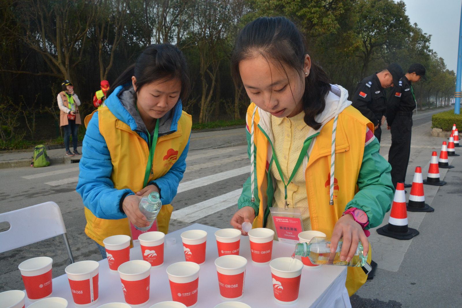 比赛当日,志愿者们早早就起床了,简单的洗漱之后便在校门口集合乘坐大巴出发前往指定区域。一路上,各岗位负责同学反复强调此次志愿服务的注意事项,以确保工作的顺利进行。6点左右,到达指定目的地后,志愿者们按照事先安排,各负其责参与服务。开箱取水、开瓶倒水,忙的不亦乐乎;指路的志愿者也分布在相关路口,耐心地回答路人的问题。按照之前培训标准,他们做得一丝不苟。整个赛程,在做好本职工作的同时,志愿者们还积极为运动员加油助威。
