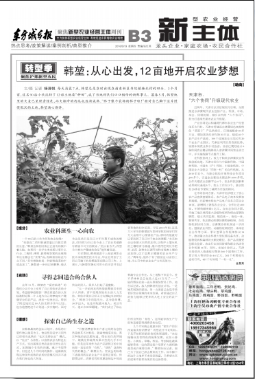 今天,东方城乡报在第B03:新主体版用2/3篇幅报道了我院首届五四班毕业生韩堃,开启农业梦想的故事。韩堃是我院第一个校企双主体班——五四班的班长,为人低调,骨子里有奋斗的劲头,能坚持做自己喜欢的事。