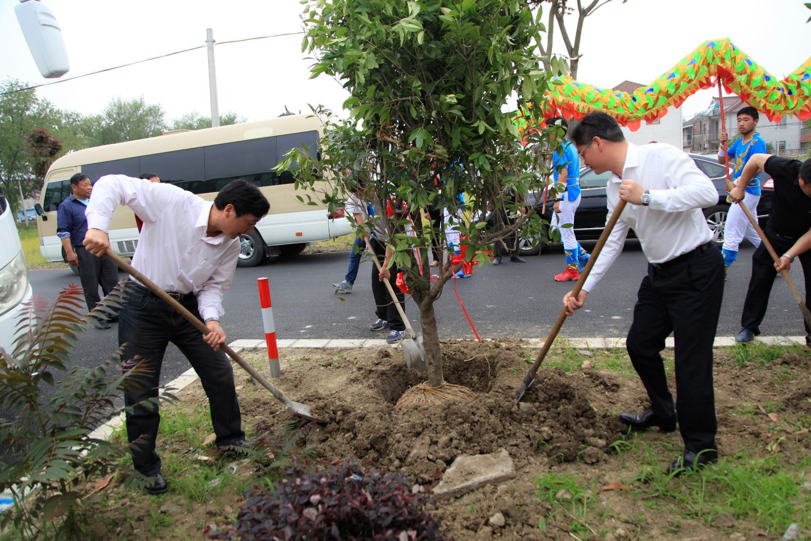 本报讯 5月14日下午,青浦区金泽镇王港村村委会的活动广场上人头攒动,“今年他们又来表演节目啦,去年也有。还有农业专家的现场咨询!”原来,上海农林职业技术学院与王港村共同举办的“携手十年共建文明”校村文明共建活动正在这里进行。现场,农林学院党委副书记俞锦祿与金泽镇党委副书记徐建青共同种下了见证“携手十年共建文明”的友谊之树(如图)。
