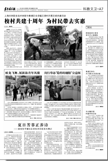 今天,东方城乡报在第A07:科教文卫版头条报道了学院与青浦区金泽镇王港村开展文明共建活动情况。