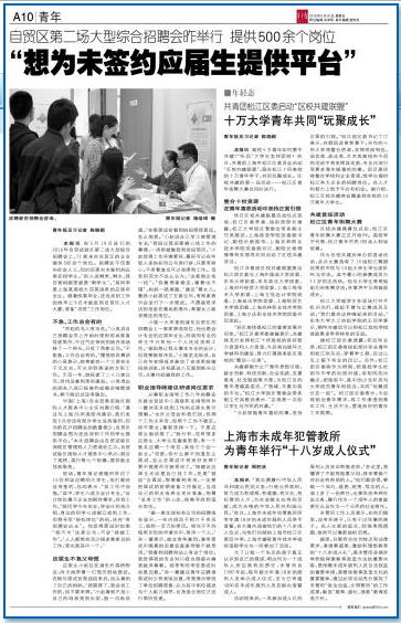 5月20日,青年报在第A10版:青年版报道共青团上海市松江区委员会启动“区校共建联盟”,我院党委副书记、副院长俞锦禄参加了区校共建联盟启动仪式,并与相关领导共同启动了区校共建项目。