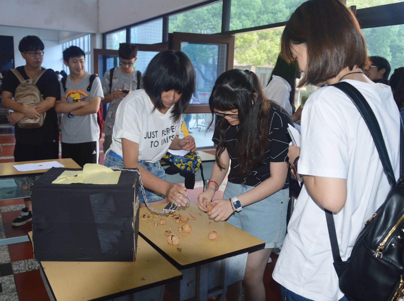 本次“奔跑吧,青春”生态节专辑活动内容是剥吃核桃比赛,由两位选手为一组进行比赛,在规定的时间内,一名选手通过原地“大象鼻子转圈”,然后从“恐怖箱”中取出核桃,剥开核桃,另一名选手负责吃核桃,以剥吃核桃的数量为基本评判标准进行评比。现场30名选手们在剥核桃的方法上各显身手,难分高低。最终生物152班蓝茜同学和环境151班丁诤杰同学取得此次活动第一名,生物152班郑佳志和生物152彭雅进同学、生物151班的奚东辉和生物151顾前悦同学分别取得第二、三名。