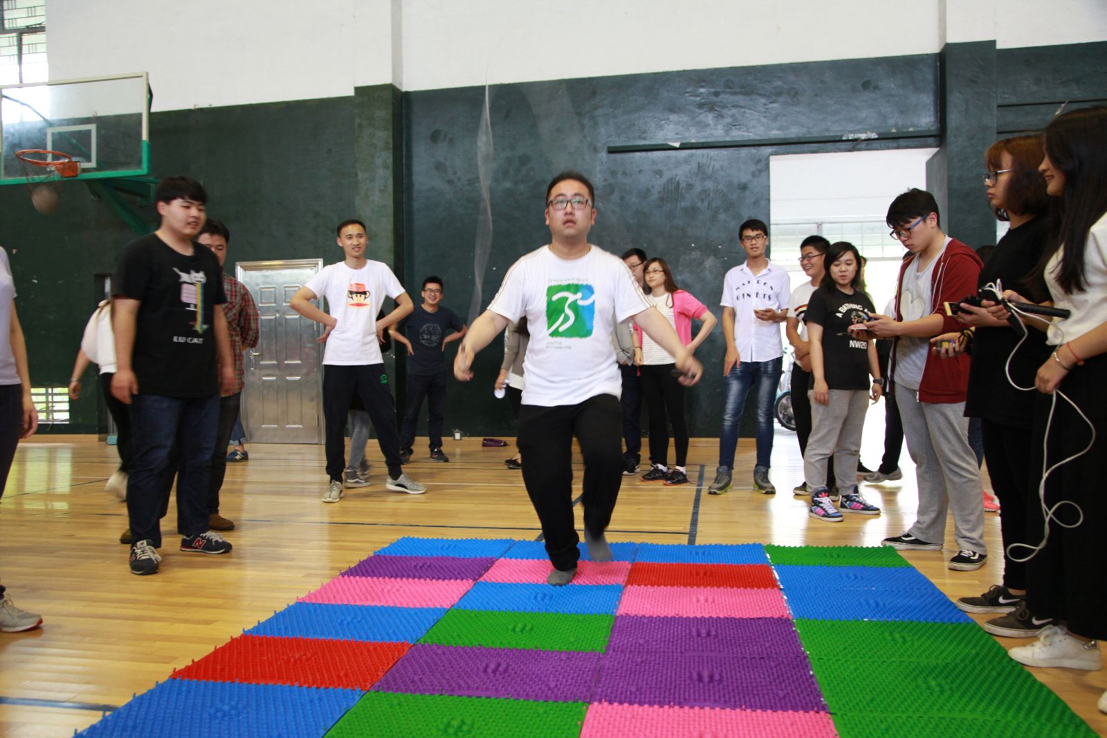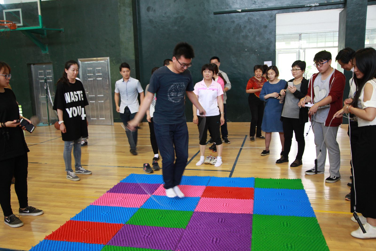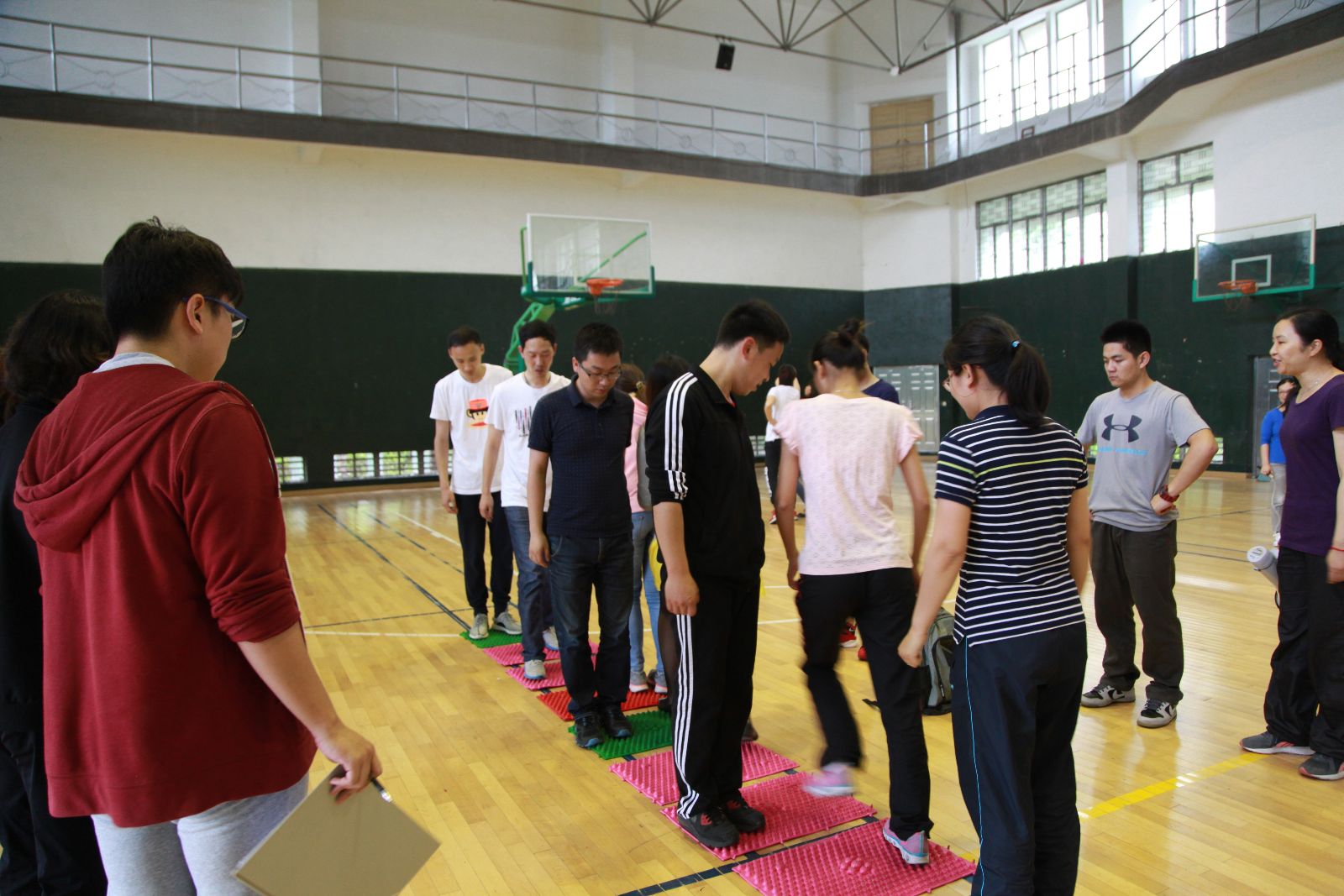 学院共12个工会小组参加了比赛,每组选手8人。当天气温比较闷热,老师们汗流浃背,但依然全身心投入。活动共三个项目,每个项目都要求小组协同合作完成,以最终的总用时作为排名依据。首先开始的是要在指压板上完成200个跳绳任务,完成后进行定点投篮,每人站在不同的点投进一个篮板,最后进行“阻塞交通”拓展活动。这些活动让广大教职工充分融入团体,在活动中增强集体意识和团队合作意识。