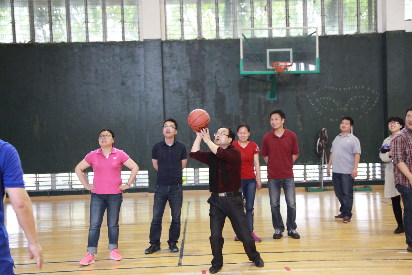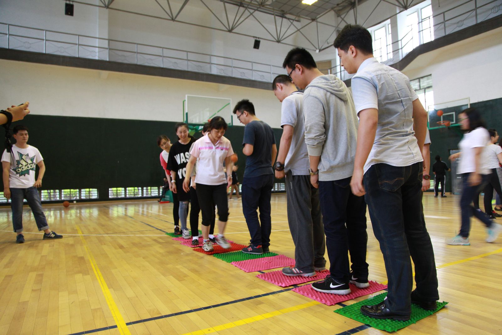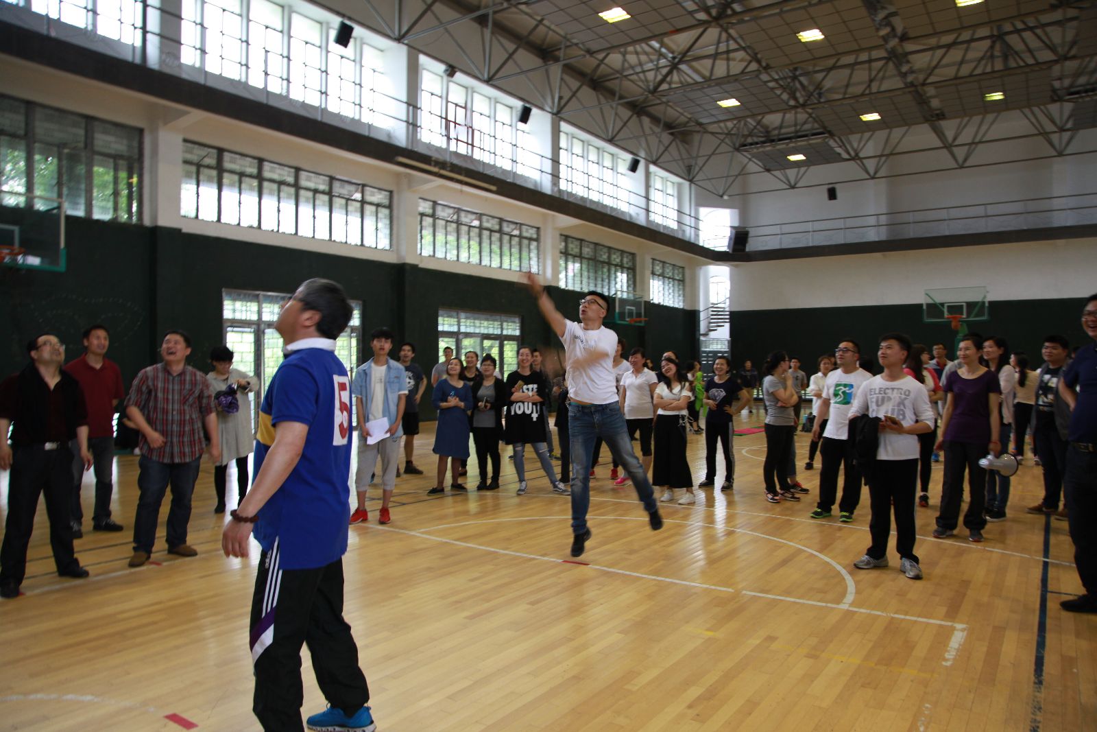 学院共12个工会小组参加了比赛,每组选手8人。当天气温比较闷热,老师们汗流浃背,但依然全身心投入。活动共三个项目,每个项目都要求小组协同合作完成,以最终的总用时作为排名依据。首先开始的是要在指压板上完成200个跳绳任务,完成后进行定点投篮,每人站在不同的点投进一个篮板,最后进行“阻塞交通”拓展活动。这些活动让广大教职工充分融入团体,在活动中增强集体意识和团队合作意识。