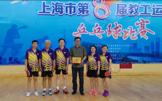 6月4日,上海市第八届教工运动会乒乓球赛在华东理工大学举行。工会主席高功辉带领我院教工代表队参加了高校B组的比赛。比赛是五人对抗,5场3胜。我院代表队由三男两女组成,分别是魏华、石万方、翟晶、许英杰和邰光玉五位老师。5场比赛必须全部进行(淘汰赛阶段除外)。五位老师在面对强手学校时,依然能够镇定自若,发挥水平,赛出了学院历史上的好成绩。经过全天的激烈竞技,夺取该组第五名的好成绩。