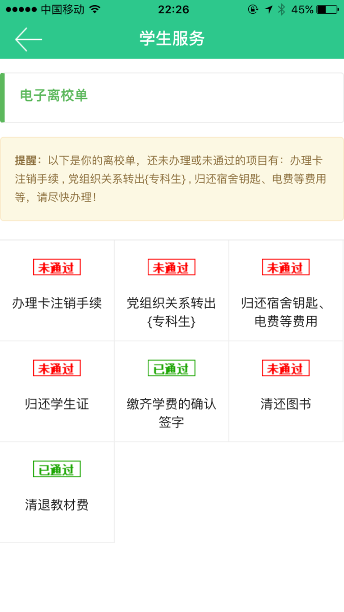 6月15日起,学校启动电子离校系统来实现网上离校办理。系统包含了清还图书、清退教材费、缴齐学费、退宿等环节,离校项目提前设置,学生通过身份认证登录系统后,可以在网上查看离校需要办理的项目,所有环节一目了然。老师可以便捷地查询学生的离校信息,实时了解学生离校手续办理的情况,及时提醒和督促学生进行离校手续办理,同时,学校领导能够通过离校系统,便捷地了解学生的离校办理情况。它解放了学生,也解放了职能部门管理员,彻底告别了线下纸质离校单。