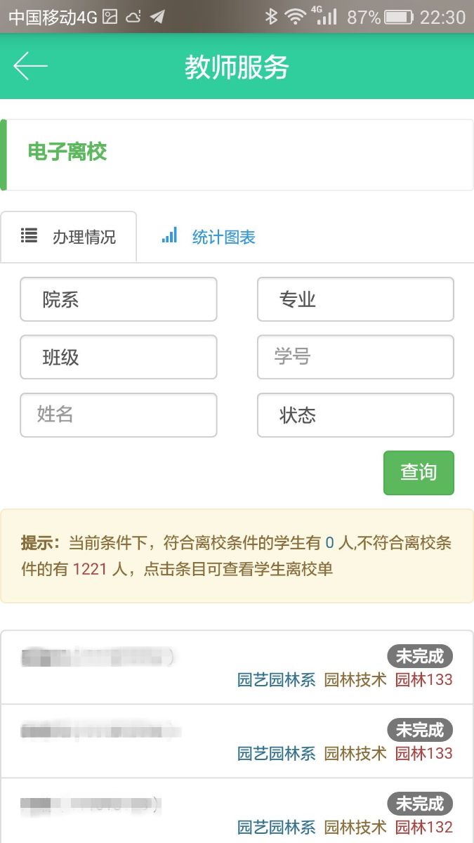 该系统是面向全校毕业生、学校各院系及职能部门,集各项离校工作于一体的信息管理平台,改变了传统的离校模式,营造了方便、高效的离校办理环境。随着网络技术的发展和智能移动终端(手机、PAD等)的广泛运用,学校还在“i尚农”APP中加入了移动离校的功能,教师可以及时了解学生的离校办理情况,学生可以查看本人各个离校项目是否办理完成。相信有了广大师生的支持,系统会不断完善,使毕业生离校更舒心,教师经办更省心。