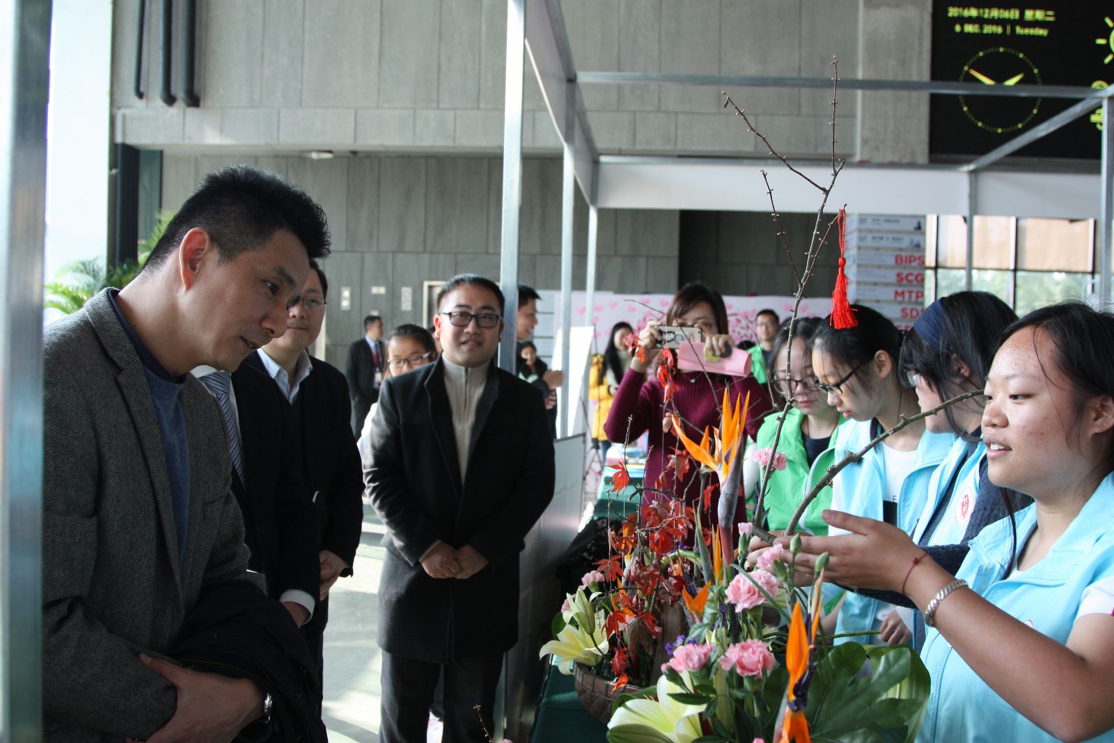 12月6日下午,在松江区国际志愿者活动现场进行的插花互动环节中,很多外校同学纷纷拿起花材和我院志愿者们共同体验插花乐趣。院青协志愿者代表还与松江其他高校志愿者代表一起庄严宣誓,使同学们更深刻地理解“志愿者”这一身份,不仅是荣誉,而且是希冀,需要承担更多的责任和奉献精神。