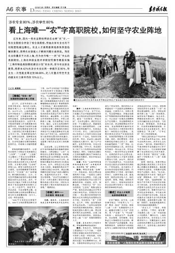 12月8日,东方城乡报A6农事版,整版报道了在农业院校“去农化”现象严重的今天,我院作为上海唯一一所以现代都市农业为特色的高等职业技术院校,在秉承“为农服务,特色立校”的办学宗旨,坚守农业职业教育,为上海农业培养专业管理和技术人才等方面所做的努力,还专访了院长魏华。