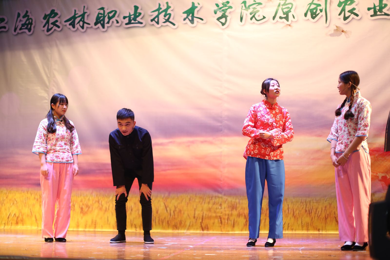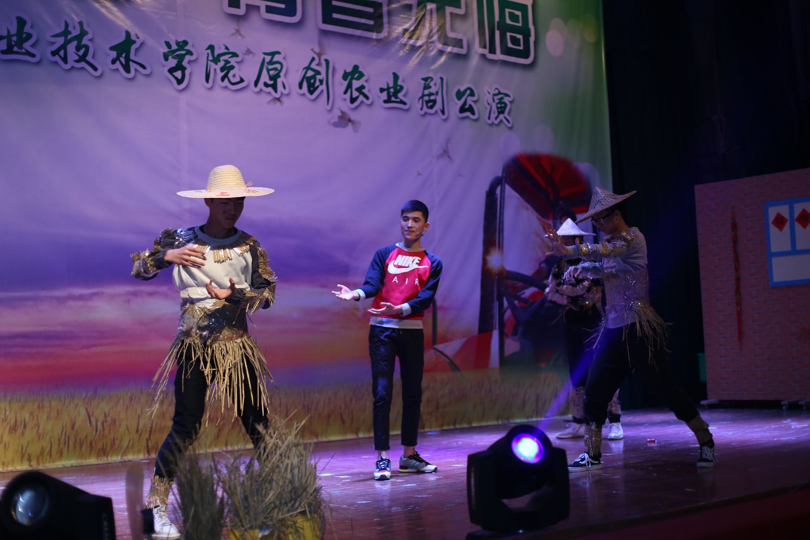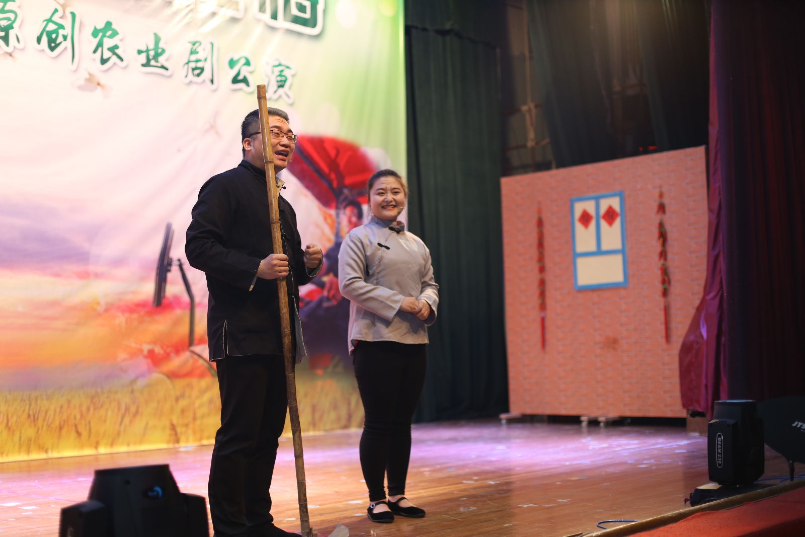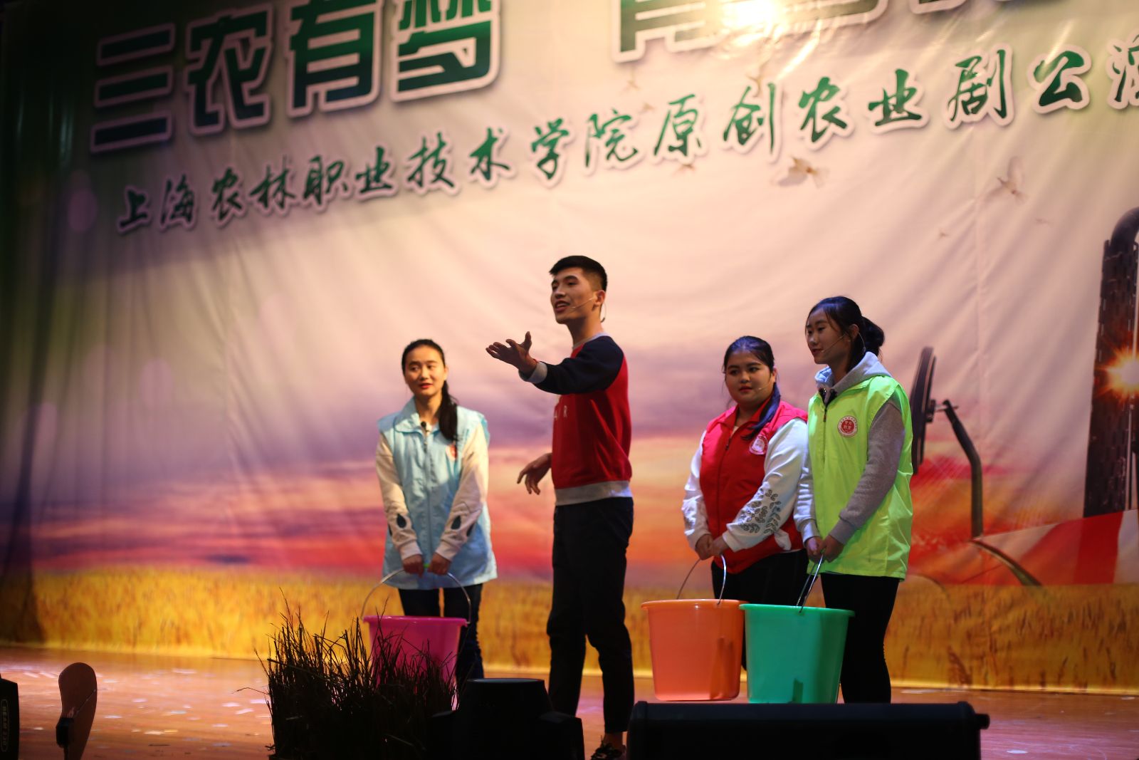 农业剧《三农有梦,青春无悔》由我院师生自编、自导、自演。该剧以白尚农、黑乐耕两位主人公在农村的生活点滴为主线,将新农业、新农村、新农民的发展历程通过幽默诙谐的人物对白、发人深省的剧情内容呈现出来,激发上农学子投身农业的热情,坚定从事农业的决心,以“学农、爱农、务农”为荣。剧中黑土的扮演者是园林152班张振洲,白云的扮演者是设施152班乔粒粒,青山的扮演者是网络162班王治辉,其余由大学生艺术团舞蹈队、演艺队、声乐队、民乐队等同学共同参演。