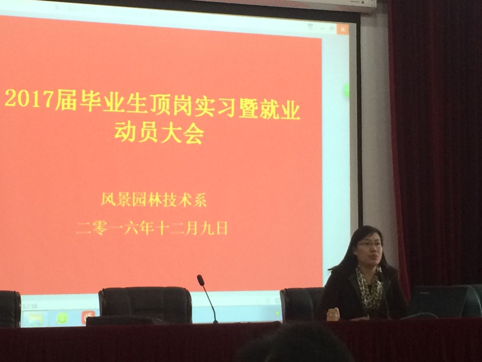 12月9日下午,在学术报告厅,园林系召开2017届毕业班学生顶岗实习暨就业动员会。系支部书记张海娜、顶岗实习指导教师、毕业班辅导员和园林系2014级138名学生参加。