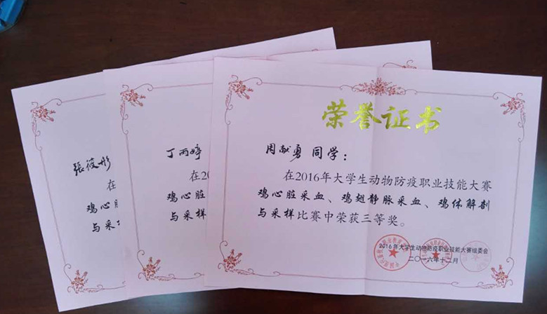 比赛采取理论考试和现场操作技能考核相结合的形式进行,技能考核包括鸡翅静脉采血、心脏采血、鸡体解剖与采样等项目;奖项设团队奖和特等奖、一、二、三等奖,获奖比例为60%。比赛中我院三名选手沉着冷静,全力以赴,发挥稳定,最终获得三等奖的好成绩。滑志民和曹彩琴两位老师获优秀指导教师奖。