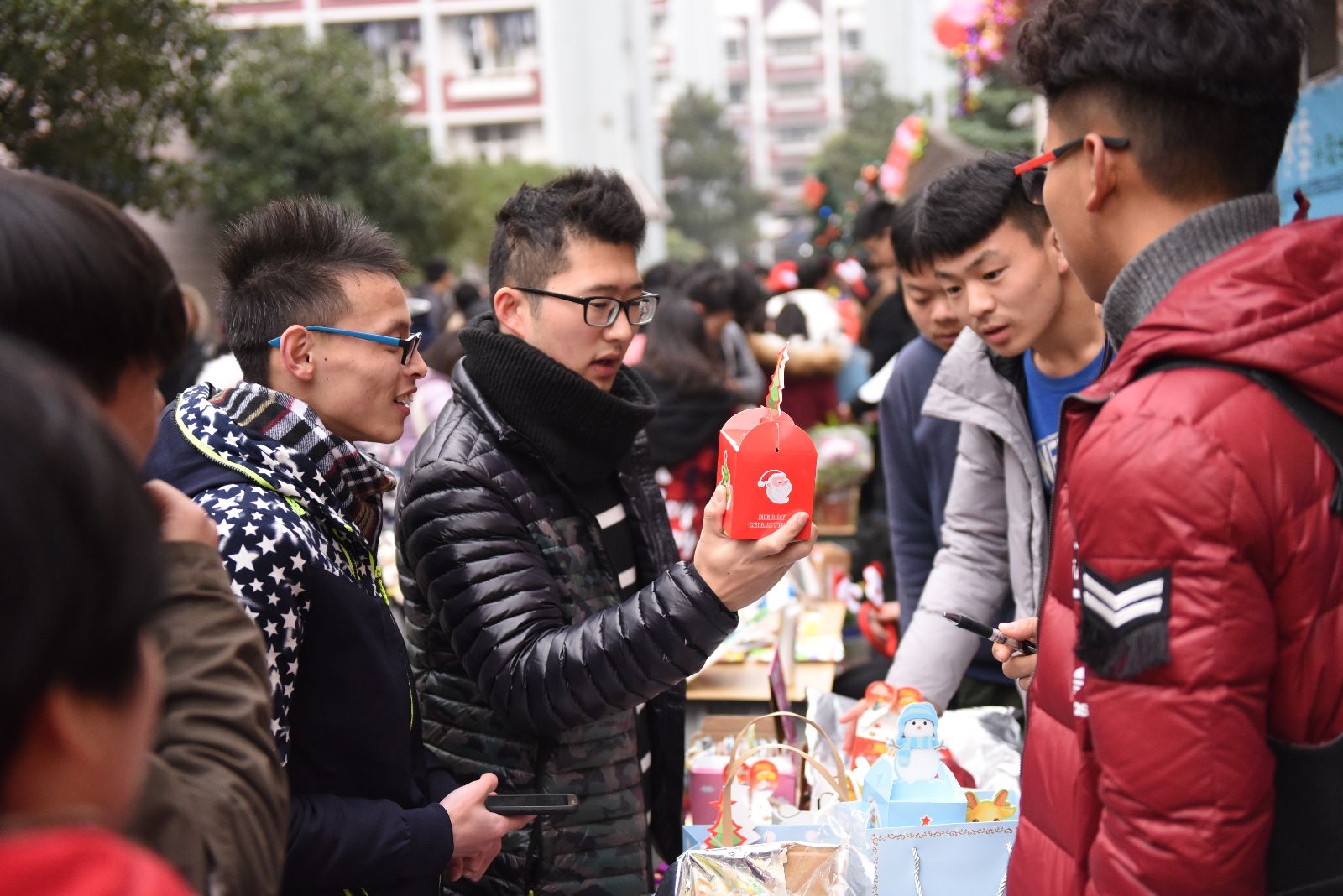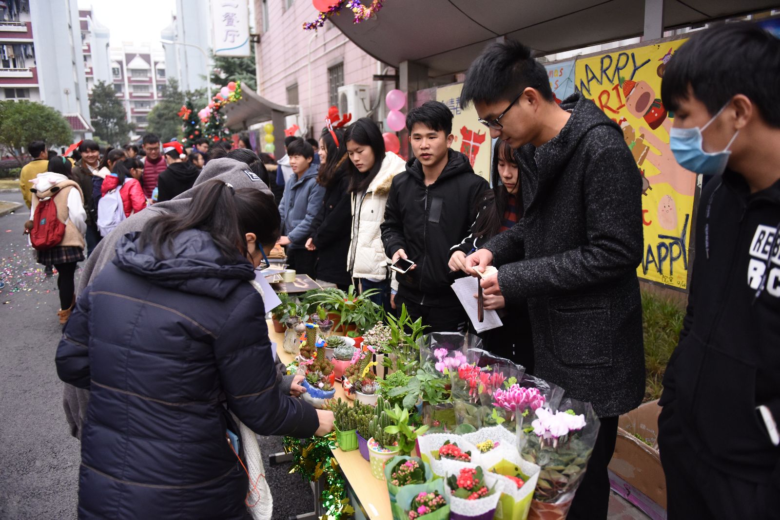 活动以“圣诞营销”为主题,无偿提供12个经营摊位,全部收益归摊主所有。同学们对此反响强烈,纷纷踊跃报名。活动当天,获得摊位经营权的同学在圣诞创业街的舞台上大展拳脚,各显神通。有的结合自身所学专业特色,进行创意组合,售卖自己设计制作的手工制品、组合盆栽;有的借助节日氛围,售卖各种有关圣诞主题的小挂件、小零食;有的以围脖暖冬为售卖主题,搭配各式饰品,现场做起试衣模特,吸引顾客。整场活动人潮涌动,气氛热烈。