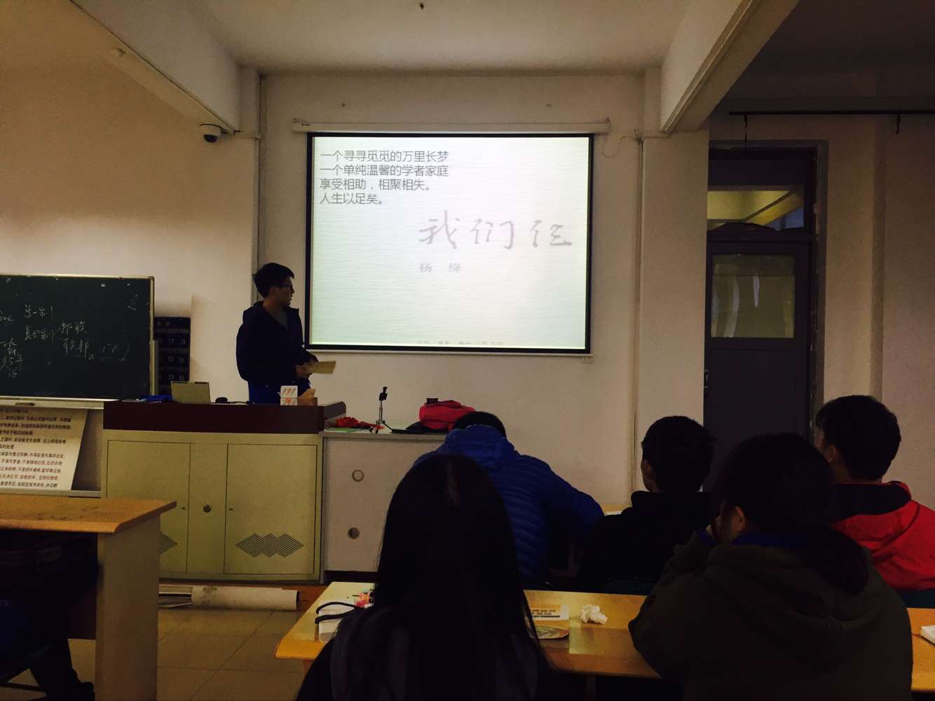 同学们积极响应,认真准备。各组在选定分享书目后,通过网购、图书馆借阅等方式进行仔细阅读,共同构思商讨PPT制作,然后在班会上分享自己的读书心得。生物162班胡铭华同学通过一份朱元璋的简历展开对历史长篇小说《明朝那些事儿》的荐读;生物161班黄紫懿、钱婧蕾同学通过人物对话的形式再现路遥笔下《平凡的世界》;环境162班陈晓倩、质检162班陈帆同学分享的《我们仨》,让现场师生身临其境地感受到杨绛先生一家的生活点滴;环境161班束晨超、质检162班张平同学分享的《时间旅行者的妻子》唱响一首爱战胜时间的颂歌;环境162班张俊紫同学分享的《小王子》最具小王子风,语言画面全带童真童趣;此外分享较多的图书还有日本作家东野圭吾的《解忧杂货铺》、钱钟书的《围城》以及张爱玲、三毛、林语堂等名家名作。