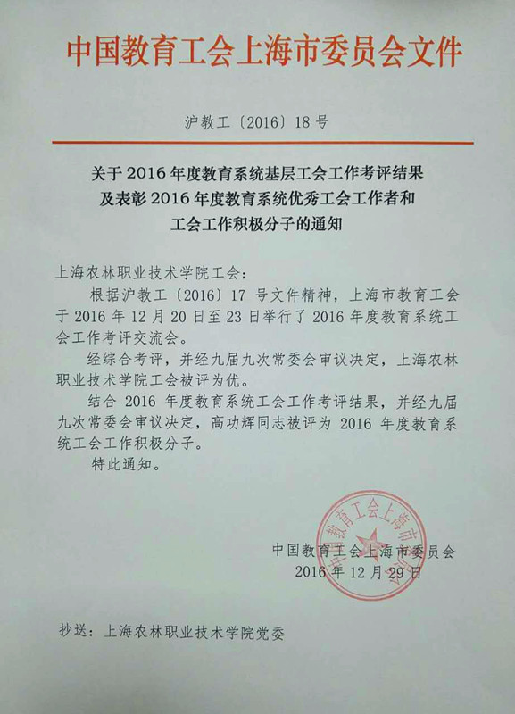 近日收悉,中国教育工会上海市委员会《关于2016年度教育系统基层工会工作考评结果及表彰2016年度教育系统优秀工会工作者和工会工作积极分子的通知》(沪教工〔2016〕18号),我院工会在2016年度教育系统基层工会工作考评中被评为“优”,工会主席高功辉被评为2016年度教育系统工会工作积极分子。