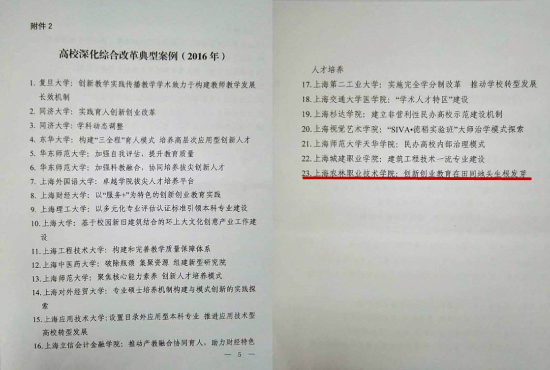 近日,市教委发布《上海市教育综合改革领导小组办公室关于公布上海市教育综合改革典型案例(2016年)的通知》(沪教综〔2017〕1号),上海市21所高校共23个案例被选入2016年市教育综合改革典型案例。作为入选的两所高职院校之一,我院报送的教育综合改革案例《创新创业教育在田间地头生根发芽》榜上有名。这是我院连续第二年入选上海市教育综合改革典型案例。