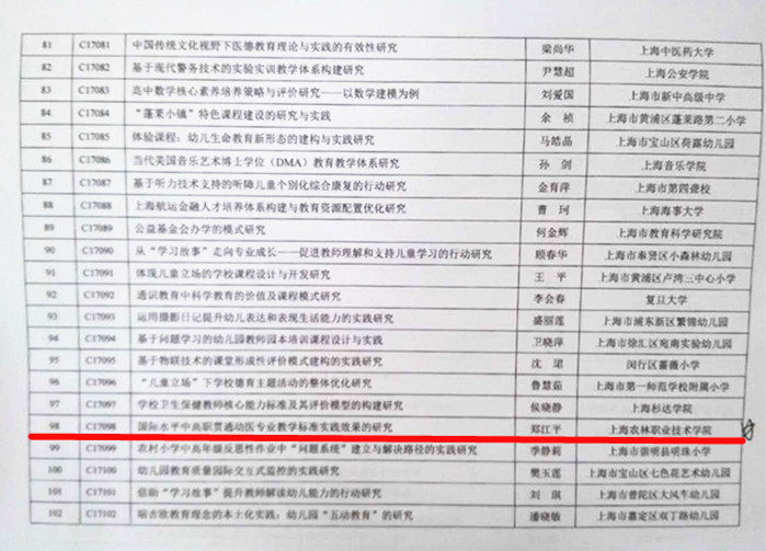 日前,经专家评议、上海市教育科学规划领导小组审定,我院教师郑江平申报的课题《国际水平中高职贯通动医专业教学标准实践效果的研究》被获批为2017年上海市教育科学研究一般项目。
