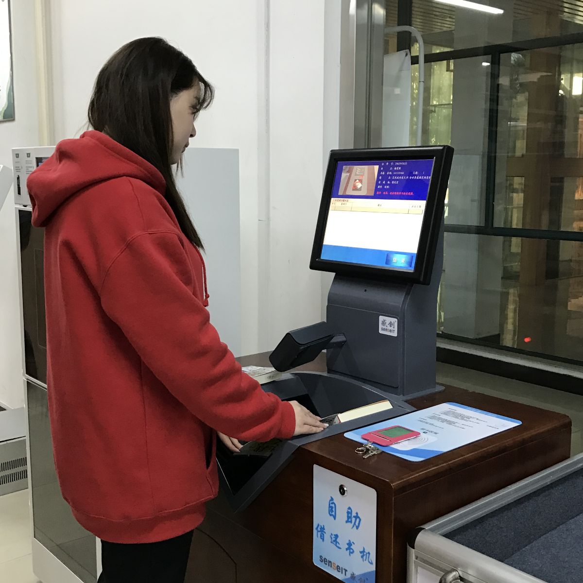 自助借还书机位于图书馆借还室,通过与图书馆自动化系统数据相连接,读者按照设备上的提示,可自行借还图书,整个借还过程几秒钟内即可完成。该设备因无需工作人员参与,还可保护读者隐私。试运行期间,几乎所有的读者在正确掌握了使用方法后,都会把自助借还书机作为第一选择,而不再寻求图书馆工作人员进行借还。同学们很快接受了对这些新科技设备的使用,表示自助式设备使用起来简单、方便、快捷,很符合目前的科技发展趋势。