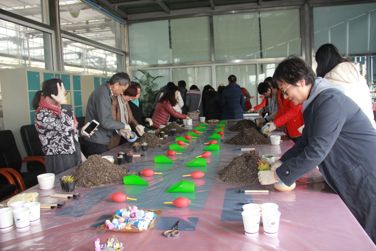 农业职业体验活动分为多肉植物种植、水培植物种植和插花三组同时进行。活动现场,在指导老师的帮助下,每位参与者都亲手种植了一盆属于自己的多肉景观盆栽、一份水培植物和一件花艺作品。在老师的细心讲解下,大家初步认识了一些基本植物,了解了各类植物种植的基本技巧和插花艺术的美学鉴赏等基础知识,纷纷表示此次活动十分有意义。