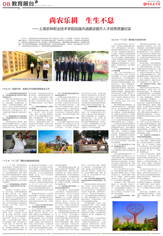 3月15日,由教育部主办的以教育新闻为主的全国性日报《中国教育报》,在08版以图文并茂的方式,整版报道了我院党政领导班子带领全院教职工,在加强内涵建设提升人才培养质量方面所作的工作和努力,走出了一条具有自身特色的跨越发展之路,展现了我院作为上海市唯一一所“农”字号院校的独特风采。