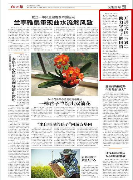 今日,《松江报》03版民生新闻版,报道了我院《大国“三农”》首堂课开讲的情况。松江报和上海松江发布官方微博也转发了相关新闻。