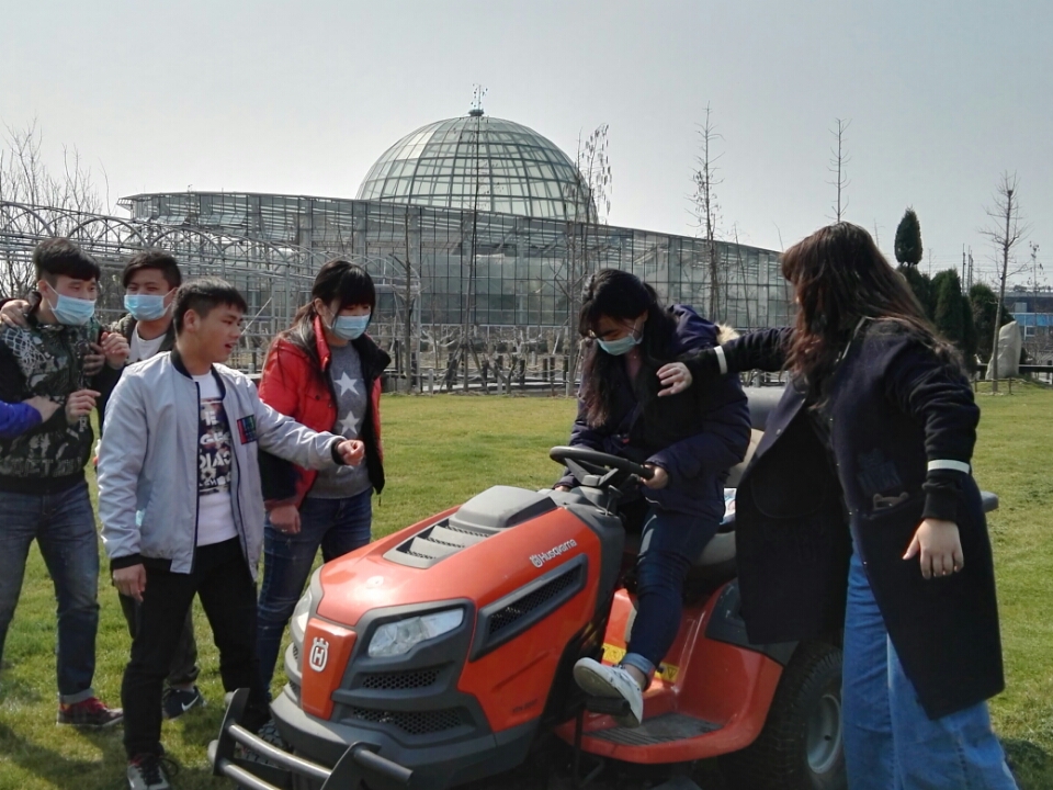 图为园艺151班的同学们正在都市农林开放实训中心学习使用割草机。